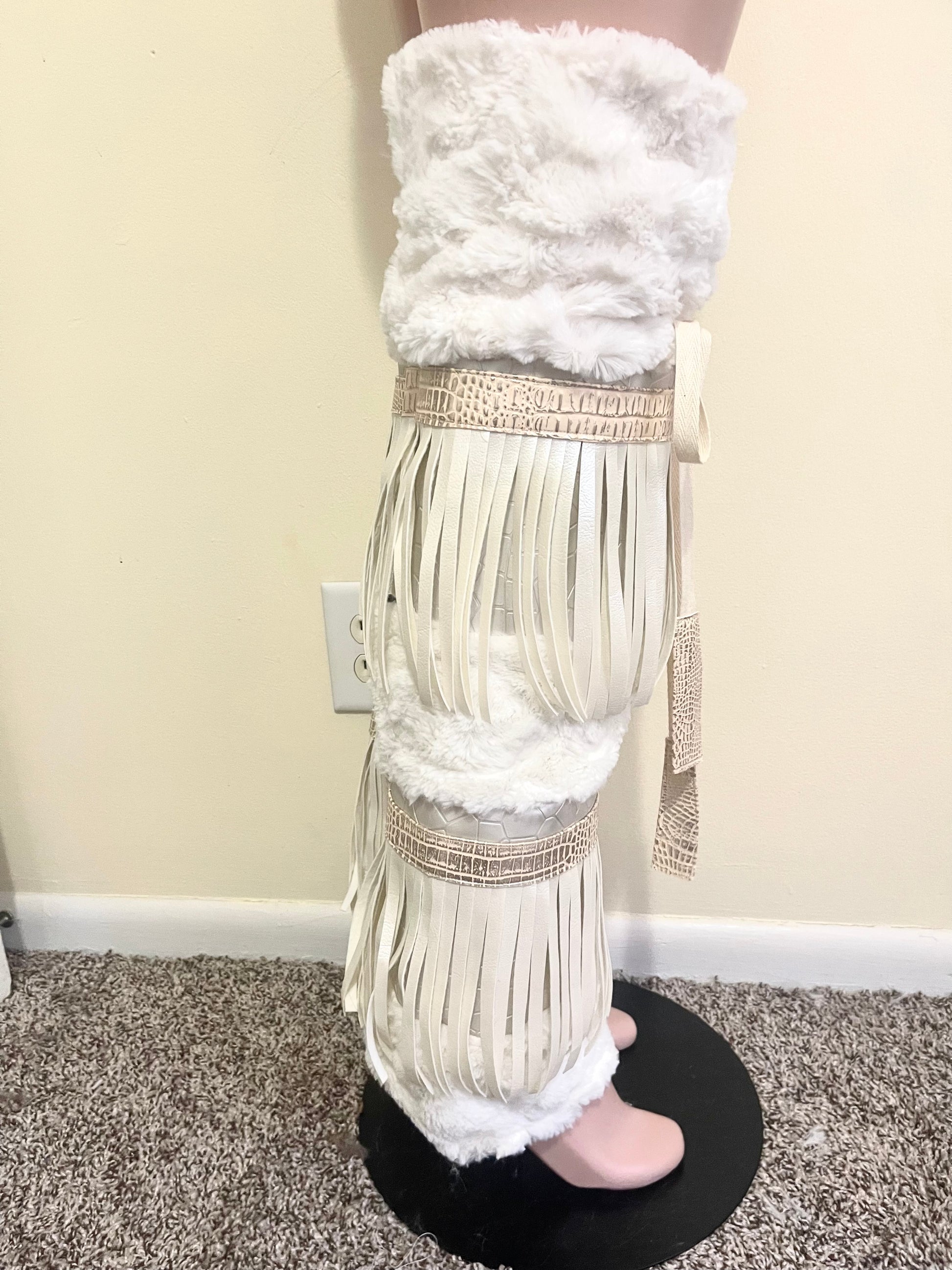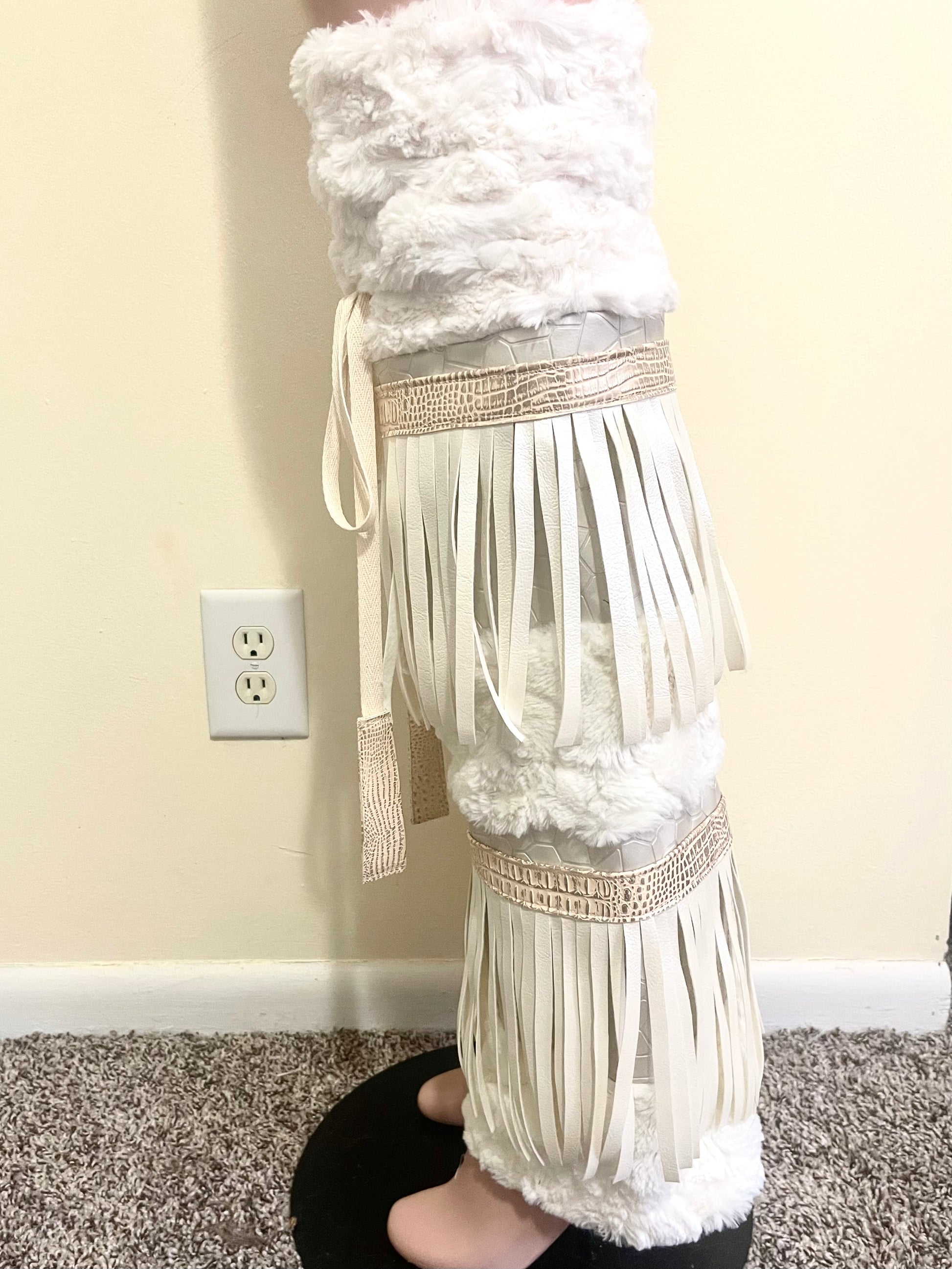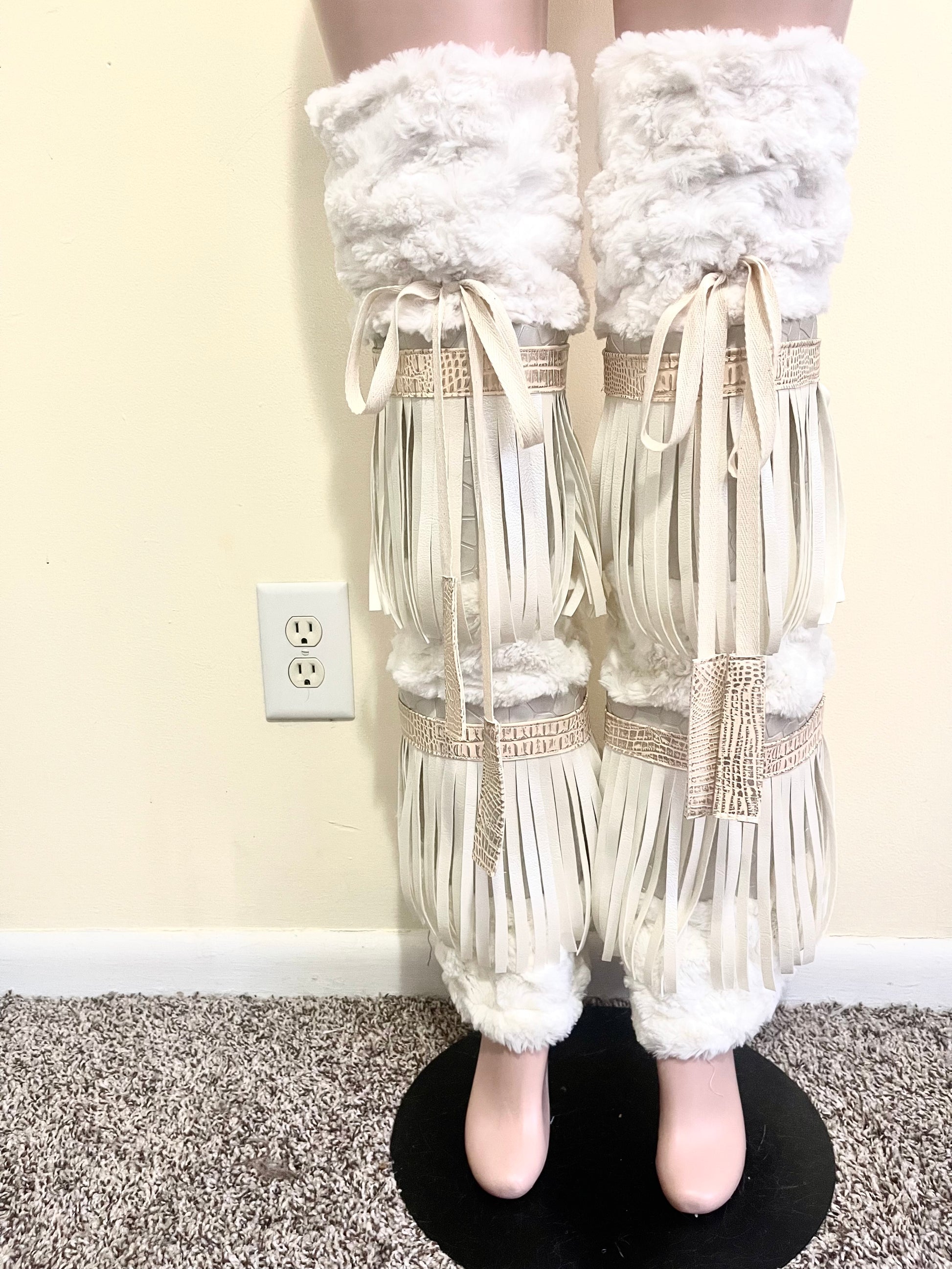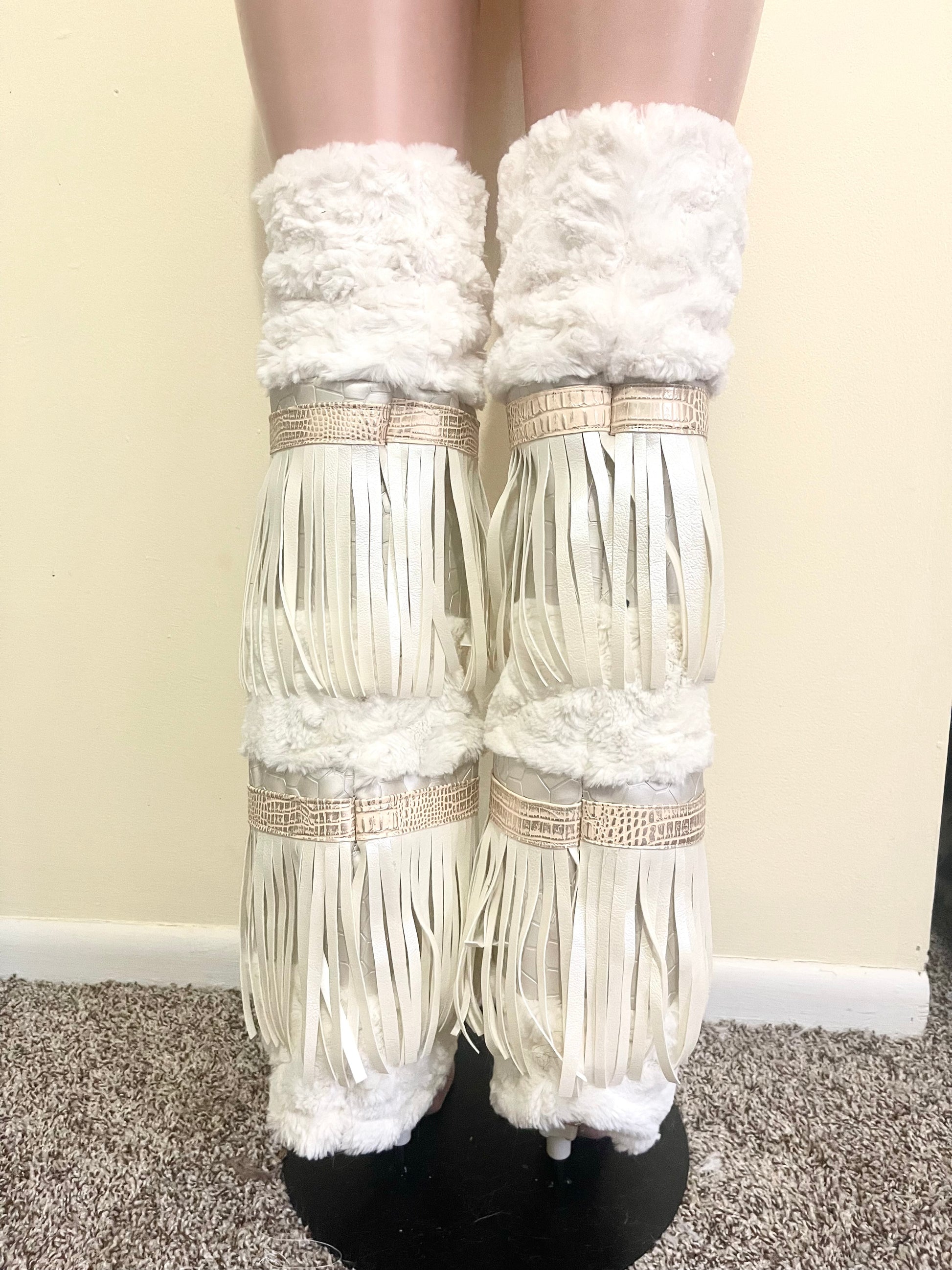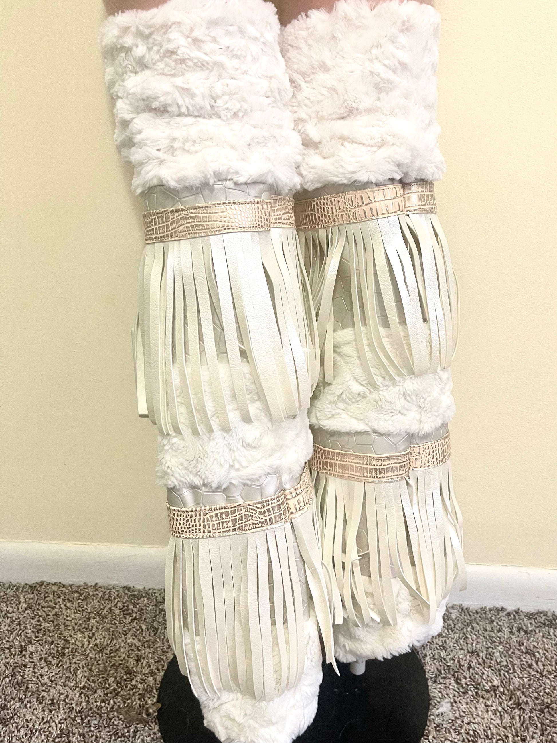 CREMEBRULEE is a very soft and exaggerate set that will definitely cause a stir when you walk in a room, with swirling cream fur, faux leather fringe, pebble and snake skin textured print leather trim with gold foiling