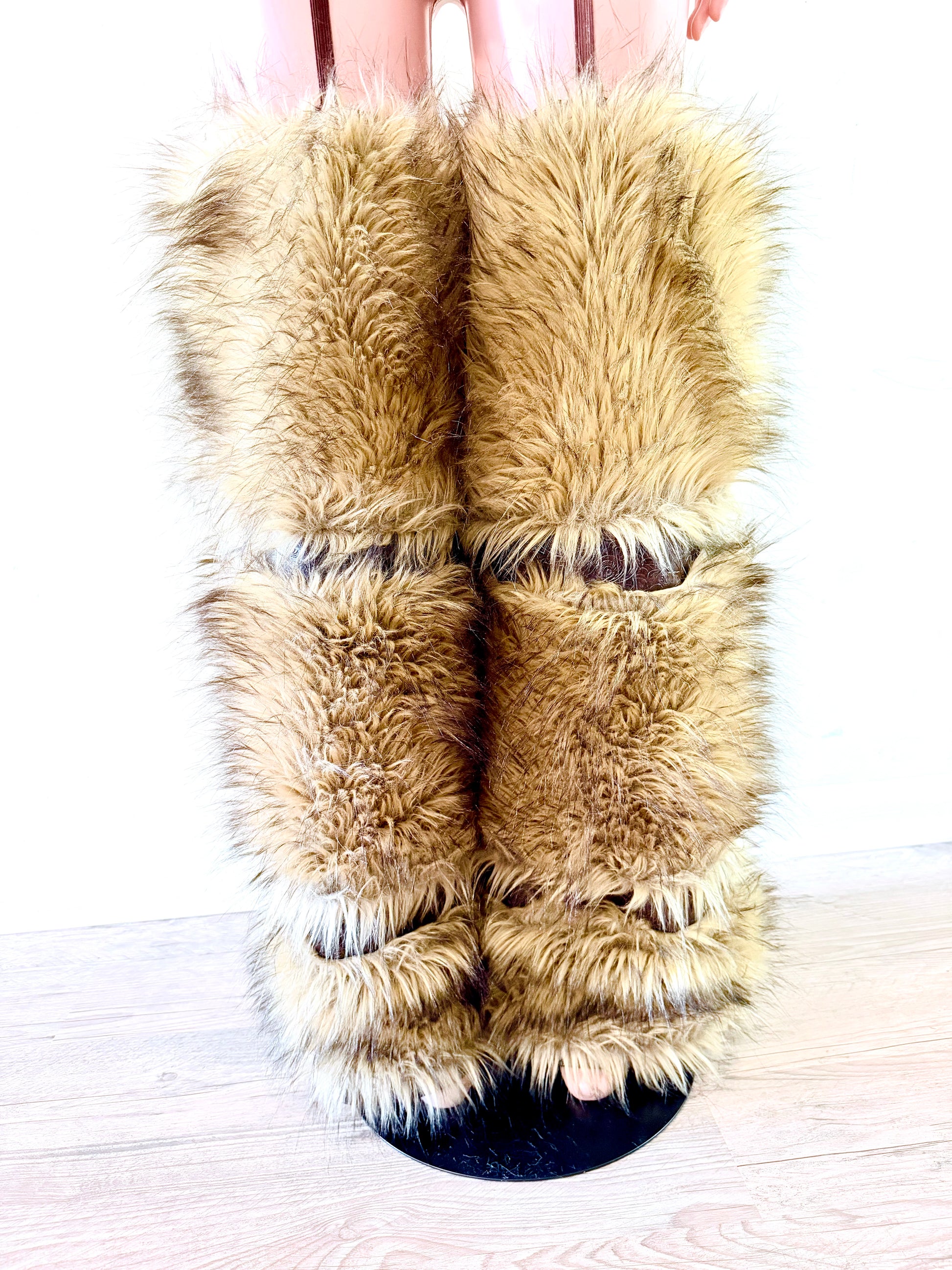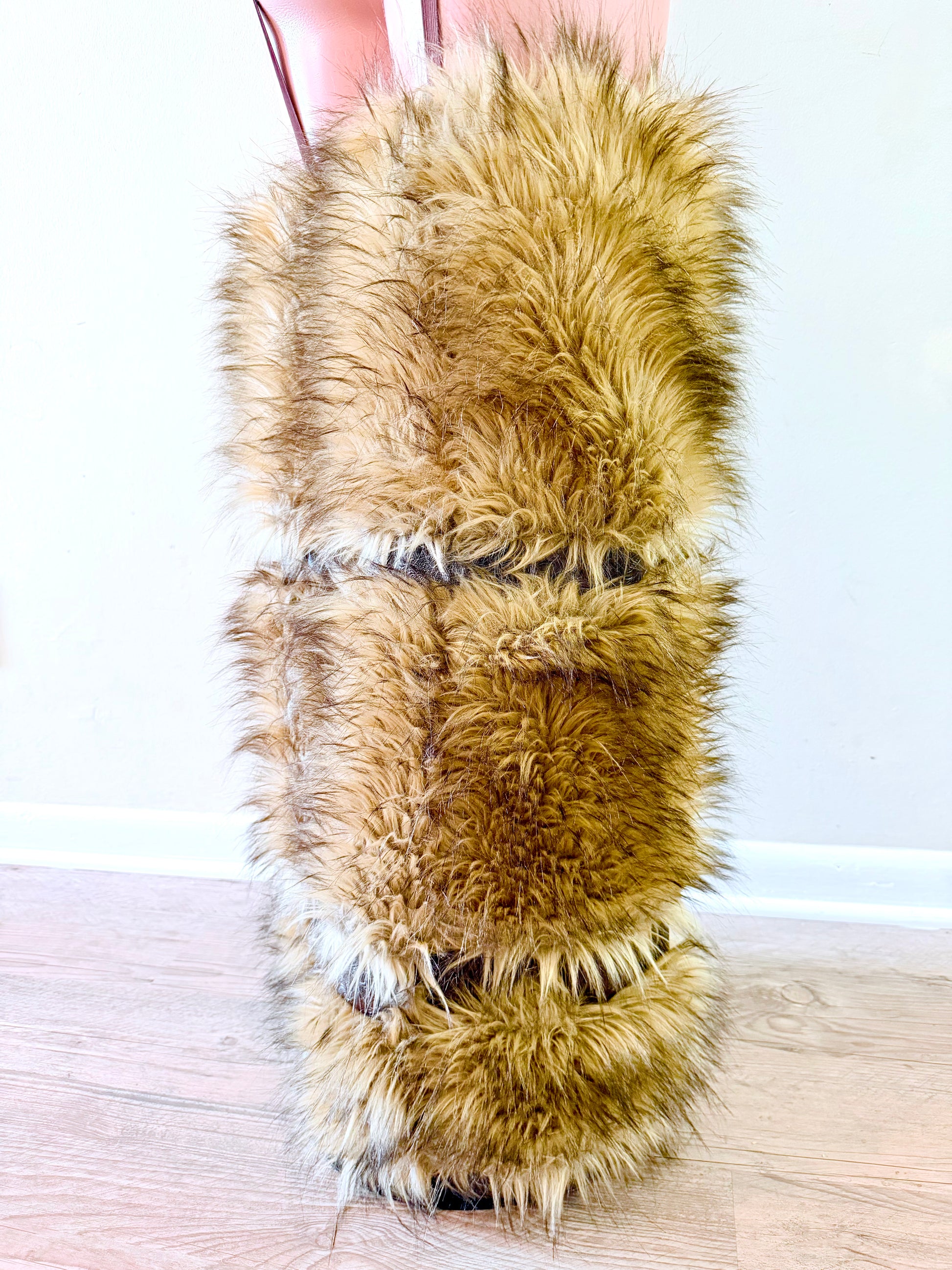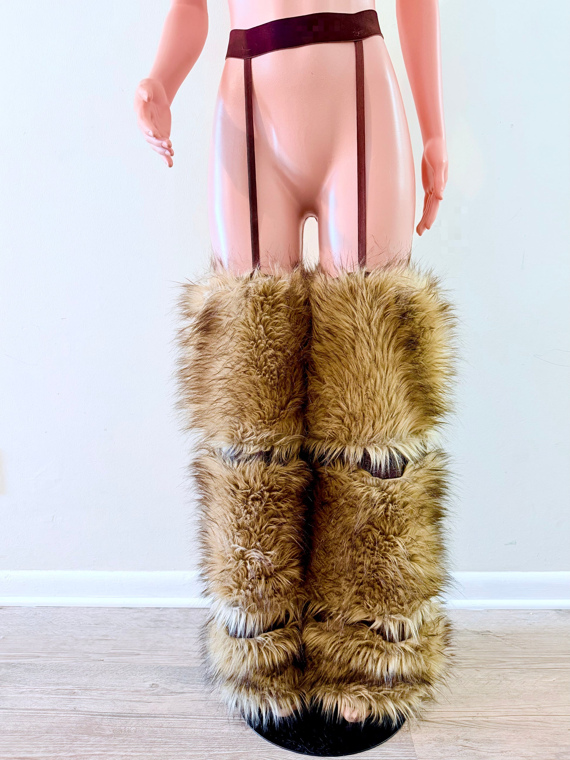 Fur legwear, faux fur pants, statement pants, festival outfit women, luxury streetwear, bold fashion outfit, unique women’s clothing, fur leg warmers